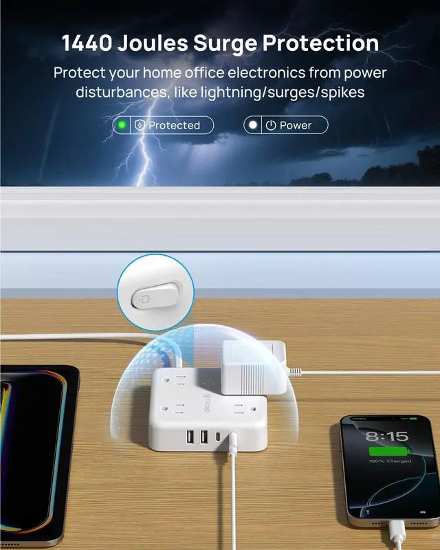 Two Prong Surge Protector: The 2 prong extension cord provides 1440J protection for your