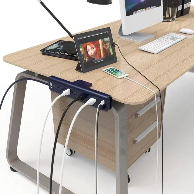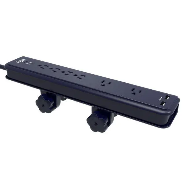 Featuring a unique and easy-to-use built-in clamping system for attaching the unit to desks, tables, shelves, and workbenches. Perfect for a garage, computer lab, office, etc. Elegant dark grey design to match professional business products. Two outlets have extra-wide spacing for large "wall wart" power adapter bricks.