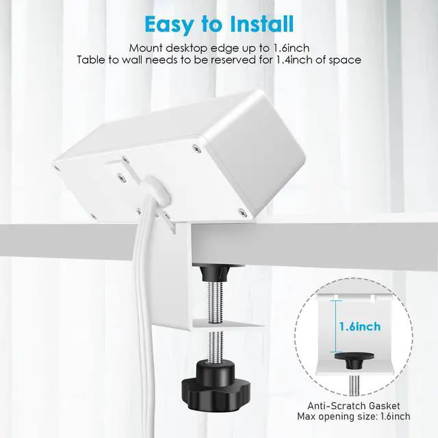 The desktop power strip has an angle design, with a distance from the table to the wall of about 1.4 inches and a maximum desk edge width of about 1.7 inches. It comes with a power cord length of approximately 6 FT, and the upgraded plastic pad protects your desktop.