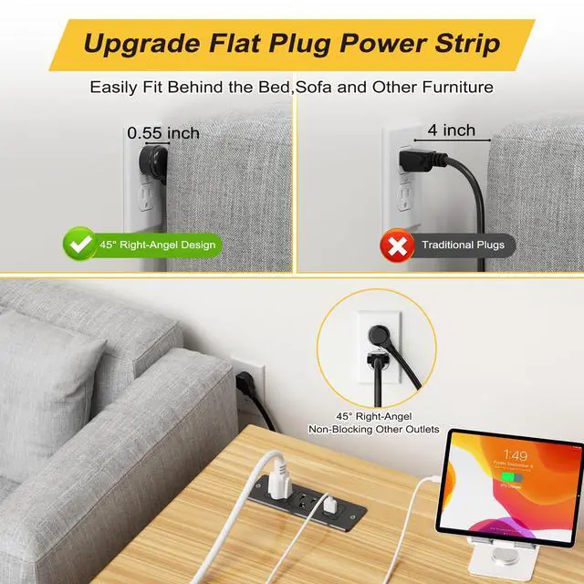 Flat Plug Extension Cord 6ftWith an ultra-thin flat head (only 0.55 inches), our flat plug power strip can easily fit in tight spots and hide behind furniture (sofa / bed / nightstand) with wall-flush alignment; The 45° right angle plug creates extra space for other receptacles below without blocking.