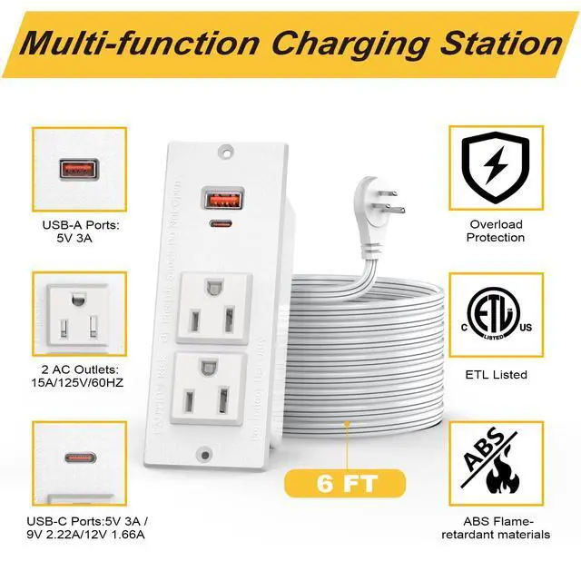 Recessed Power Strip with PD 20W USB C: Built-in two type USB ports, USB C Output: PD 20W Max, 5V 3A / 9V 2.22A / 12V 1.66A; USB A Output: 5V/3A; Two Type USB Port, can charge your phone, tablet, and other USB devices.