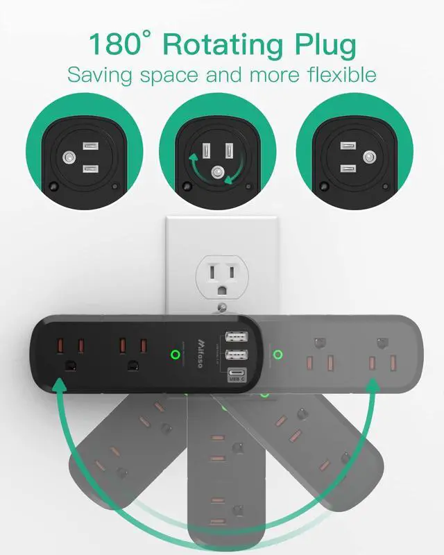 Wide Space & Rotating AC Plug - Unique 3-Side space-saving design power strip, 6 AC outlets with ample space in between, allowing for big plugs without blocking each other. The swivel power strip can turn left and right 90 degrees conveniently, with a compact design (3.5 x 4.8 x 1.7 in) for easy portability and use anywhere needed.