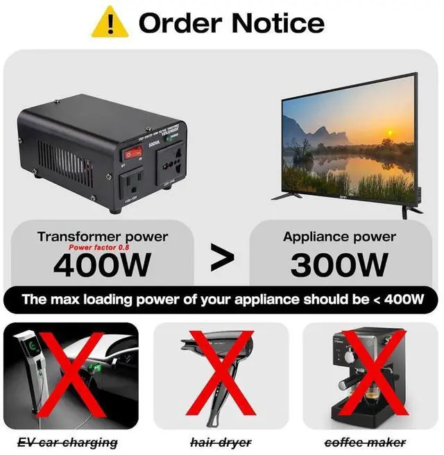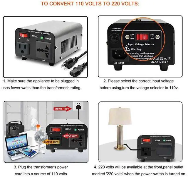 WarningThe 500W transformer cannot support high-wattage appliances (e. g. coffee makers hair dryers rice cookers microwaves AC units or curling irons). For these devices use our 3000W transformer. This is NOT an isolation transformer. Voltage transformer (110V to 220V 220V to 110V) We provide you a safe dependable stable cost-effective & easy solution to converting voltages from 110 volts up to 220 volts or from 220 volts down to 110 volts. [! Please switch to the correct input voltage before you plug in(110V in US/CA/MX 220V in UK/EU/Australia/Hong Kong etc.