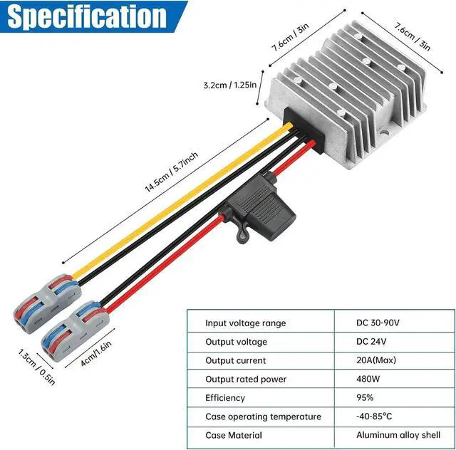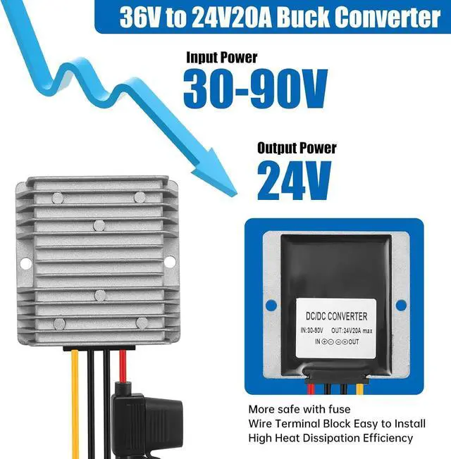 Accurate voltage stabilization 24V ± 1% 20A continuous current without frequency reduction (200 hours full load test) conversion efficiency up to 96% energy saving 30% than ordinary buck moduleFive protection circuits (over-voltage/over-current/short-circuit/reverse connection/over-temperature automatic cut-off) IP67 waterproof housing (-40° to 85°C extreme environment applicable)Wide voltage input 30-90V (automatic identification of 24V/48V/72V system)