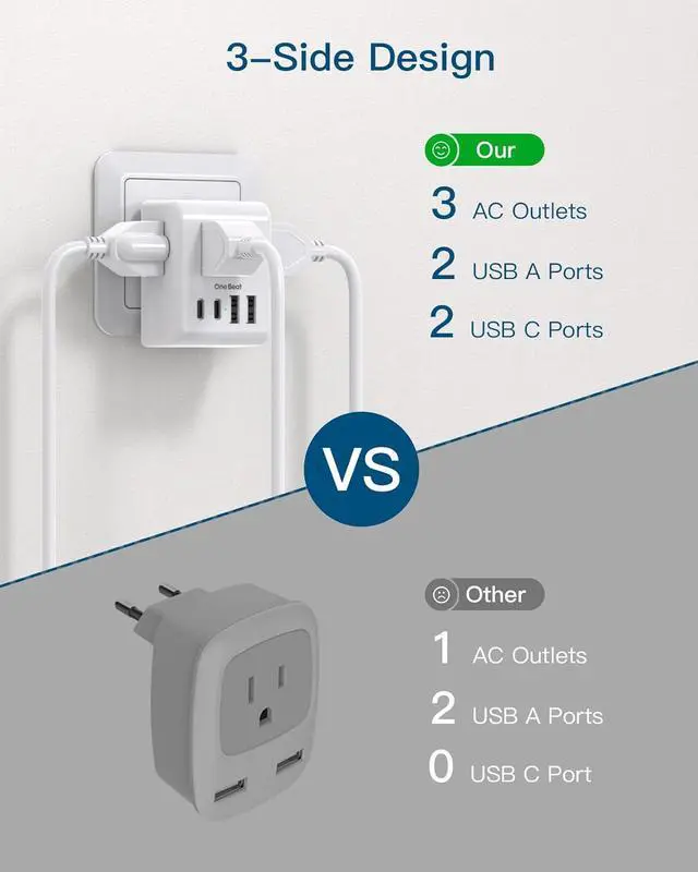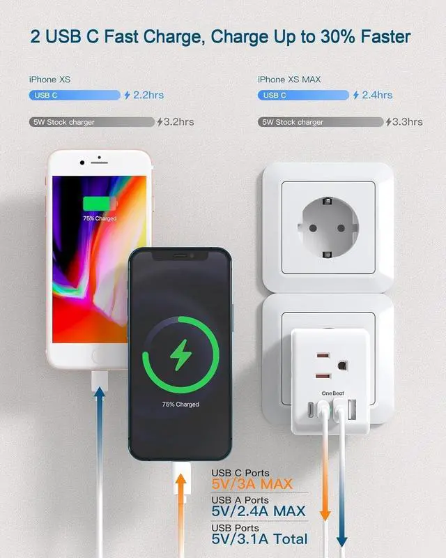 NOTE: NOT WORK in UK/Ireland/Scotland)2 USB C Fast Charge - The plug extender total output of 4 USB ports is 5V/ 3.1A. Built in smart technology the multi plug outlet can auto-detect charged devices and deliver optimum charging speed up to 5V/ 2.4A (max) each port USB-C up to 3A. ( Please note The UCB-C port is not Quick Charger 3.0 doesn't support any other devices which need 9~22V charging voltage. )European Travel Essentials- This International power adapter is mini size: 3.0 * 2.4 * 1.6 in it's easy to carry and use. Indicator can let you know the power of this European travel plug adapter is on/offNote- This is not a voltage converter; This power adapter US to Europe is only compatible for 100V to 250V wide voltage device especially your hair dryer straightener electric toothbrush or razor need to support 100V to 250V dual voltage otherwise you may need a power voltage converter