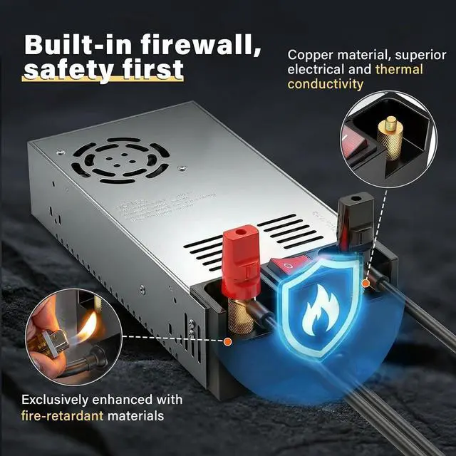 Why Choose usUnlike similar products on the market our 110v to 12V converter features pure copper terminals this design ensures enhanced conductivity reduced heat generation higher energy efficiency and greater safety. The entire black plastic section of the power connector incorporates flame-retardant materials ensuring it won't deform or ignite after prolonged operation.