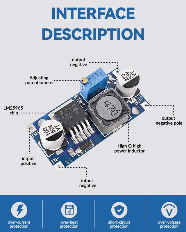 Wide Input Voltage Range: The LM2596 buck converter supports a broad input voltage range from 3V to 40V making it ideal for various applications including DIY electronics solar power systems and more. (Input voltage must be at least 1.5V higher than the output voltage; no boost function)High-Efficiency