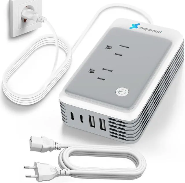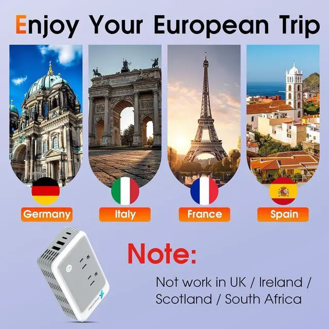 Europe's 220v power (NOTE: Not work in UK/ Ireland/ Scotland)6-in-1 Power Converter for Europe The power converter adapter combo includes 2*AC outlets 2*USB-A ports and 2*USB-C ports can charge up to 6 devices at a time enabling you to charge your Bluetooth headphones phone tablet etc. Measuring 4.9 x 2.9 x 1.3 inches the portable voltage converter making it perfect for both short and long tripsIntelligent Protection If any problem is detected the travel converter for europe will automatically disconnect the power supply after flashing the indicator light for 3 minutes. A simple restart will restore normal function. Compared with traditional systems that require manual replacement of fuses the fuse-free design provides a more convenient and reliable form of protectionSilent Operation 2026 upgraded cooling fan built-in cooling fan up to 11 000 RPM dissipates heat 30% faster than other power converters and no noise this European plug adapter provides you with a quiet and comfortable sleeping environmentSafe and Durable European travel plug adapter is made of ABS fireproof material and certified by CE/EMC/FCC/RoHS. This converters and adapters for travel includes built-in protections against over-current overload overheating and short-circuits ensuring safe use. We back our product with a 12-months warranty and 100-days refund for any quality-related issues