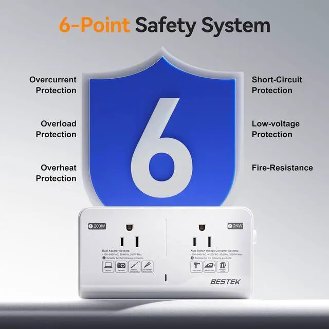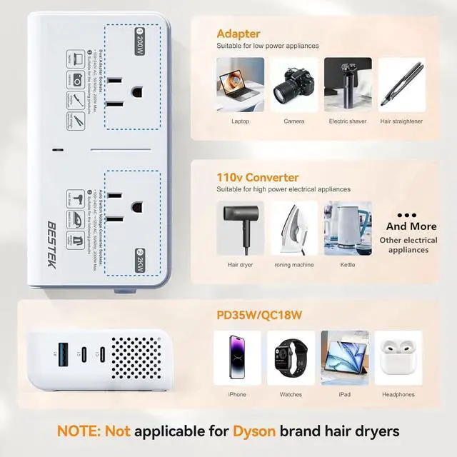 USB C 35W: This voltage converter with 2USB C PD 35W and 1 USB-A port it can charge all mobile phones such as iphone13/13Pro/iphone12/iphone8 Plus Galaxy S10/S20/S21/S22 Note 20/10/9/8 Pixel 3a/3XL/3/2XL/2 and Android devices. 18-month Warranty & Safety GuaranteedBESTEK is the only ETL certified brand in the converter market and NRTL safety tested and upgraded hardware provides complete protection for you and your devices. And this converter comes with over-current over-load over-heat and short-circuit protections.