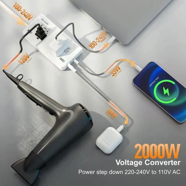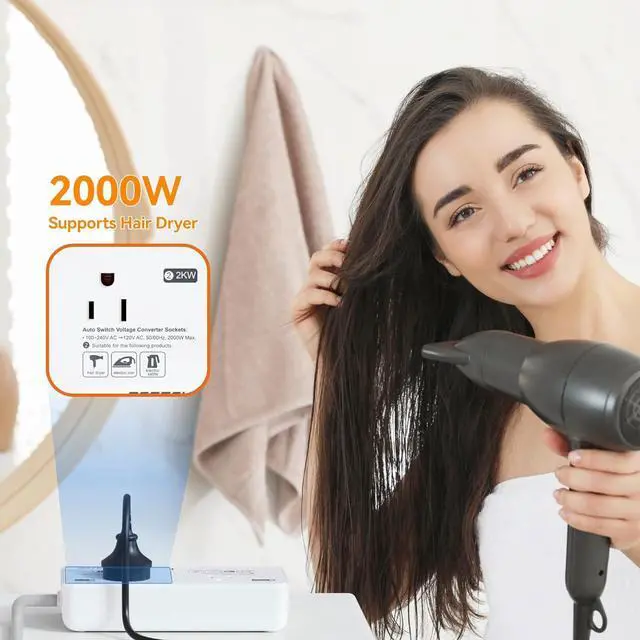 Travel Hair Dryers: The 2000W AC outlet converts 100V-240V (50/60Hz) to 120V (60Hz) for hair dryers electric kettles electric irons and more.??