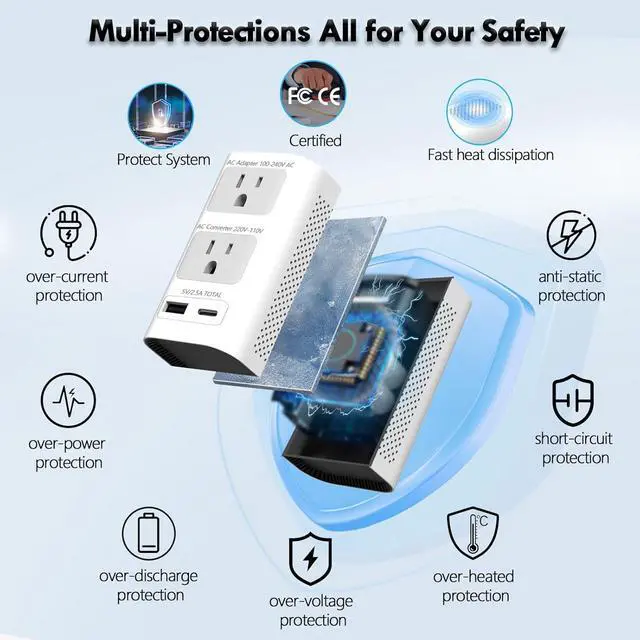 Smart Chip Upgrade: The 220V to 110V voltage converter us to europe exceeding safety standards prevalent eliminating safety hazards for your devices. Our european plug adapter converter for european travel are designed with overcurrent overvoltage and short circuit protection features along with excellent heat dissipation performance. Also it is CE/EMC/ROHS/FCC/LVD certified.