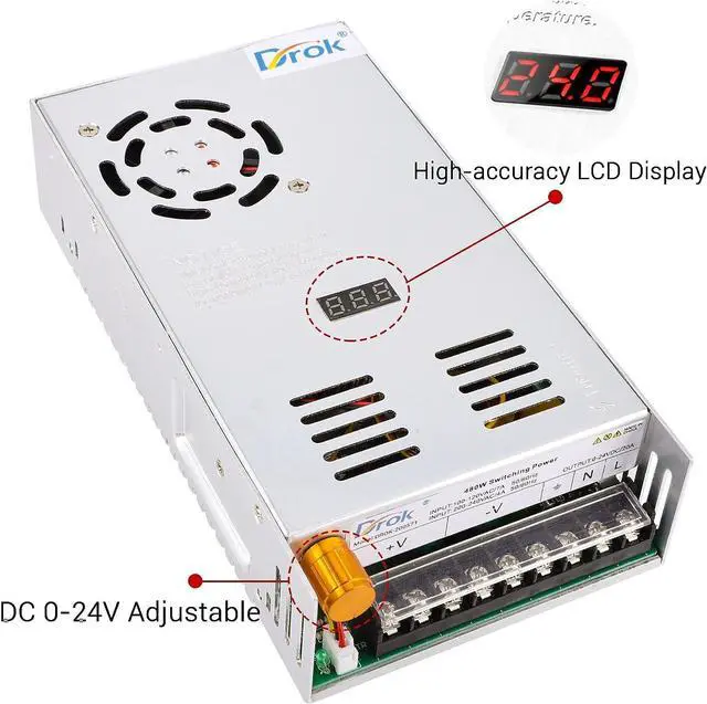 Voltage range: DC 0-24V. This supply is suitable for 5V 9V 12V 24V devices. The voltage precision is 0.1V. NoteThe maximum current is 20A. But the actual current is depended on the load. No matter how many voltage is adjusted the current is 20A and can not be regulated. It can be used to device of 2A 3A 5A 10A 12A 15A 20A. Make sure to use the devices which is below 20A. Hareware This Buck Converter is equipped with LED screen heat sink and cooling fan. The LED screen can clearly display the output voltage. Heat sink and cooling fan can control the temperature in a safe range. During the running power is high the cooling fan will automatically activate with little noise. Easy Operation This supply is no need to install after connecting wire it can be used to adjust output which is convenient. The potentiometer is inset into the supply. Only to rotate the potentiometer can adjust output parameter. Protection Over Load Protection Over Voltage Protection Short Circuit Protection which can protect your device from damage.