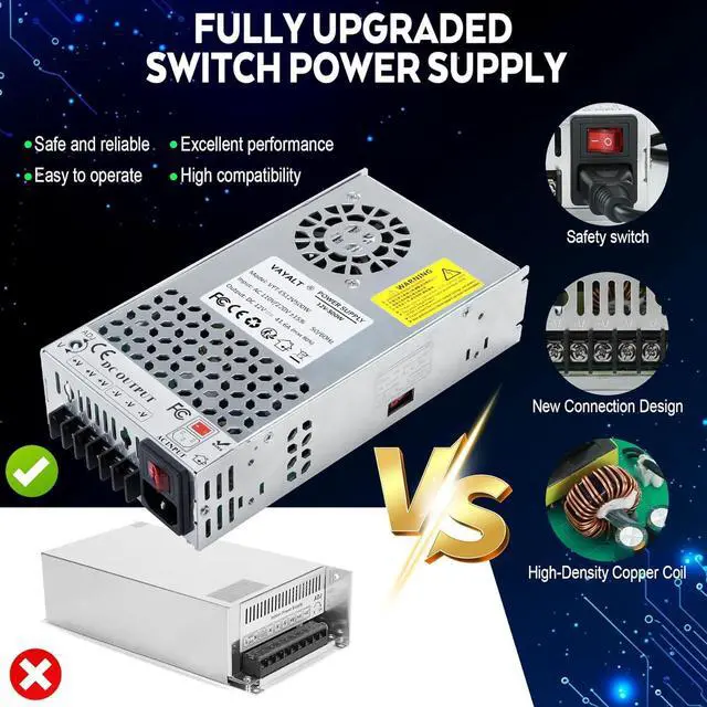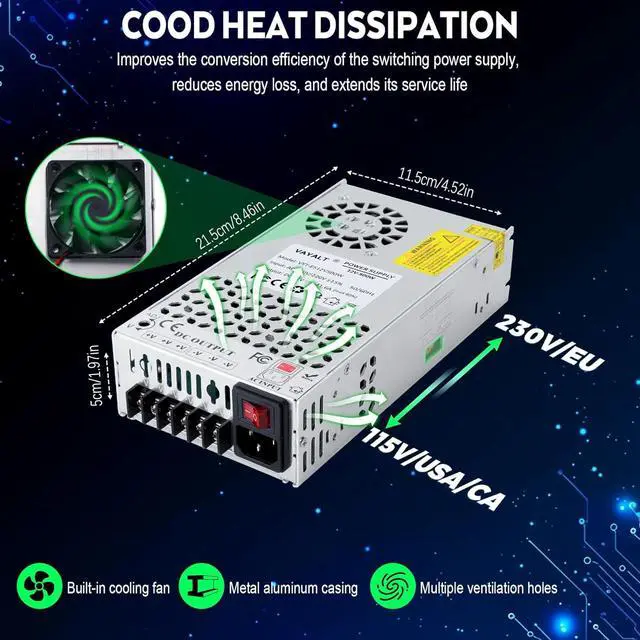 This effectively prevents the circuit board from overheating and damaging ensuring stable and efficient operation of the equipment and extending the lifespan of the power supply. Aesthetic Upgrade with Patent DesignThis switching power supply features a high-strength aluminum alloy casing built-in wire integration for convenient power connections and supports simultaneous connections for multiple devices (ensuring that the load limit is not exceeded) making operations more effortless. Moreover the full copper nickel-plated terminals offer good conductivity high conversion efficiency and corrosion resistance providing you with a more reliable and safe power supply experienceMultiple ProtectionsThe switching power supply is equipped with overloading protection overcurrent protection short-circuit protection and other functions capable of quickly responding to voltage and load changes to maintain stable output voltage and protect your equipment from damage extending its service life.