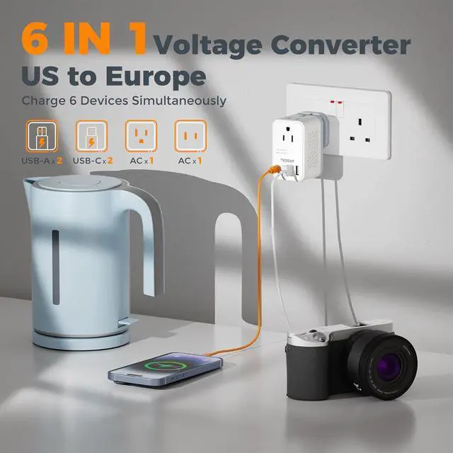 Power Converter: This universal travel voltage converter with 2 AC outlets 2 USB C (3A Per Port) 2 USB A ( 2.4A Per Port) total output 17W Max; Charge 6 devices simultaneously suitable for hair dryers curling irons laptops cameras etcCompact and