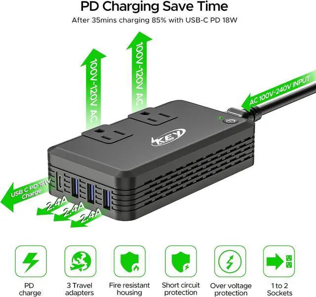 Safety Protections: Designed with over-current over-temperature short-circuit and overload protections. USB outputs are isolated from AC power to ensure device safety.