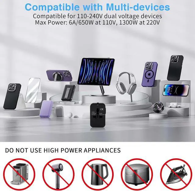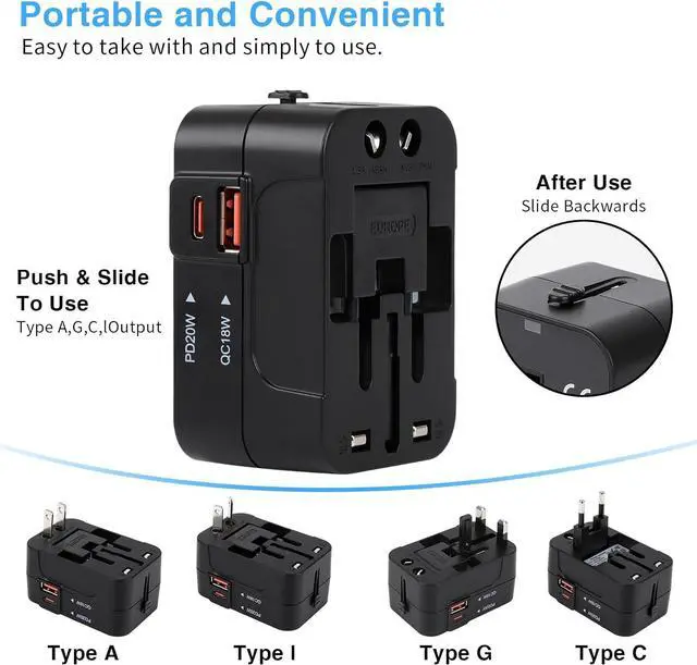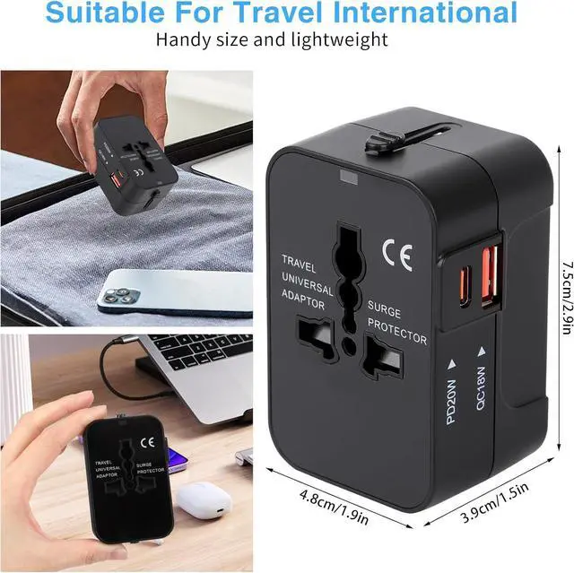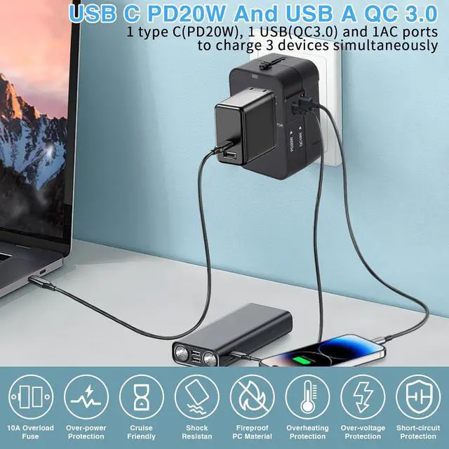 The latest updated PD20W international power adapter plug allows simultaneous use of the AC power socket and Type-C and USB-A charging portsThe travel adapter with 1 universal AC port 1 USB-C ports (PD 20W) 1 USB-A ports (QC 18W). Adapter with smart charging technology it can auto-detect your multiple devices and Improve charging efficiencyThe Charger accepts plugs from all countries including UK USA Europe Japan China Hong Kong Singapore France German and more 150 countries. But cannot be used in South African India Swiss and Italy. Please pay attention to avoid any inconvenienceThe adapter only apply to the use of low power electric appliances when traveling such as cell phones digital products computers with low power of small household appliancesThis power adapter is
