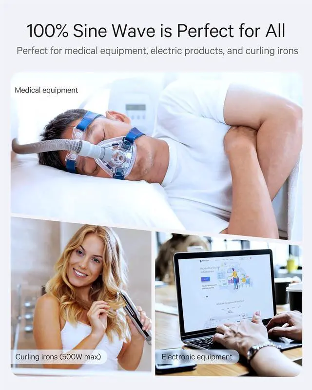 ?? Medical equipment like CPAP if you use it to help you sleep you'll be better off with a pure sine wave converter. Some CPAP warn that it may be damaged by a modified sine wave converter and others warn that CPAP will work but the humidifier unit may be damaged! [2025 Protection Design] DOACE converter safety protection includes input under-voltage (low voltage) over-voltage over-temperature overload over-current and short-circuit protection. If it's overloaded the switch closes to protect devices from damage blinking to alert for overload. Then wait for the transformer to cool and reactivate.