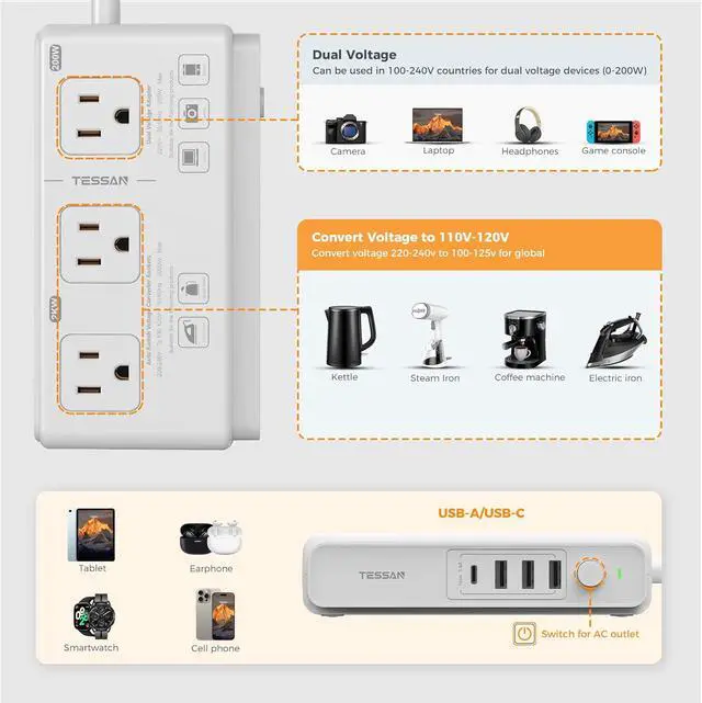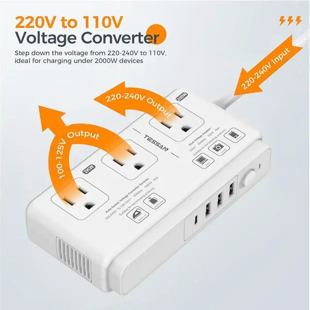 Safety Design: The travel adapter worldwide with a compact and lightweight design; Converter for european travel offers built-in safety protections against overcurrent and short-circuits; Moreover the silent fan operates without disturbing your sleepNote: The 220 to 110 voltage converter 2000W AC outlets are designed for simple mechanical motors but are not suitable for low wattage devices (0-5W) such as electric shavers or toothbrushes; The dual voltage adapter do not convert voltage; Do not use for devices over 200W or with overvoltage protection; Before plugging it in make sure to check the safety instructions for your device