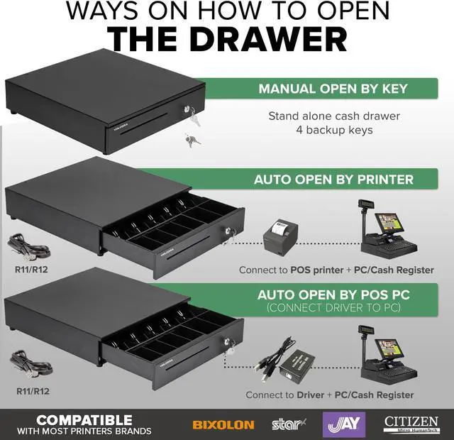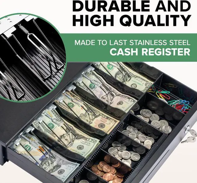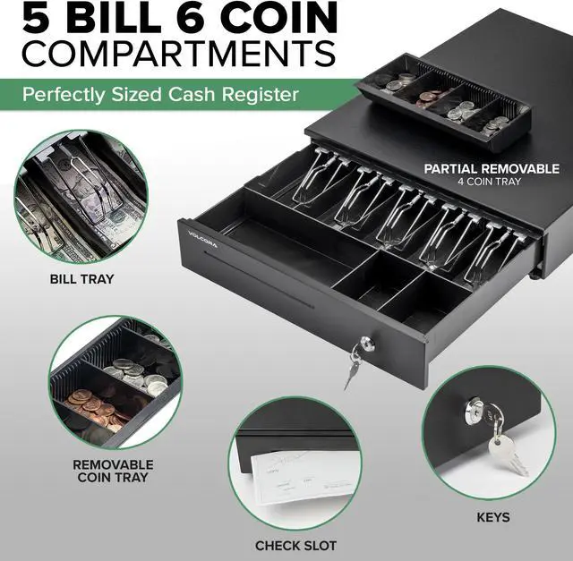 Slots - Type: 5 Bill / 6 Coin with removable coin compartment (not entire cash tray) - The package includes RJ11/RJ12 network cable to connect to your receipt / thermal printer. - Total of 4 keys for backup. - Please take note that in order to work, the cash drawer should be connected to the printer first and not directly to POS. This cash drawer has no USB ports. - 100% Money back satisfaction guarantee