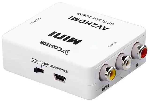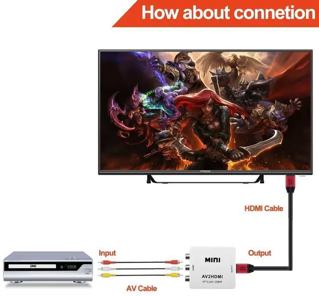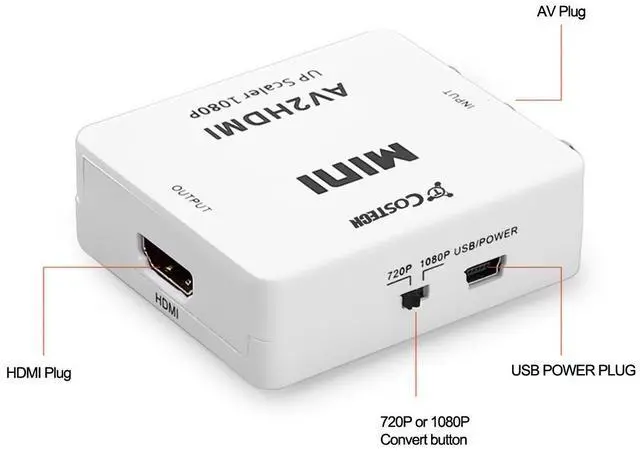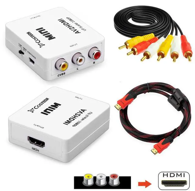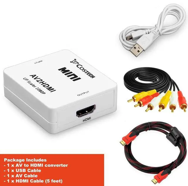 This AV/CVBS to HDMI converter is a universal converter for analog composite input to HDMI 1080p (60HZ) output. Including 5 feet Gold Plated HDMI cable and 4.5 feet Gold Plated Audio/Video cable.