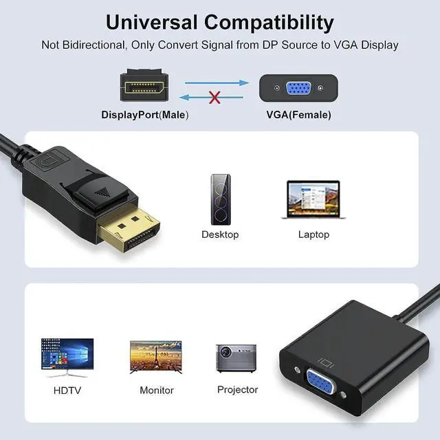 • Sturdy and Durable: The DP to VGA Adapter with quality PVC protective jacket, Tinned copper, 24K gold-plated connectors provide reliable interference-free data transmission, and improve transmission stability.