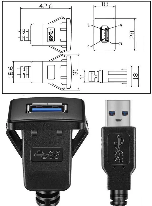 1m Waterproof USB 3.0 Extension Latch Mount Car AUX Cable for Dashboard Panel