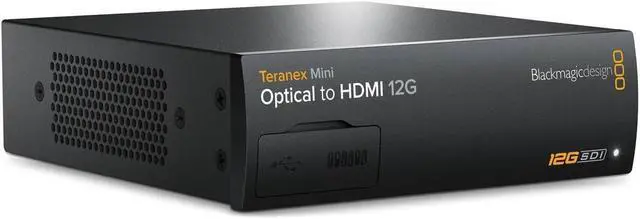 Teranex mini Optical to HDMI 12G converts 12G fiber optic and 12G-SDI to HDMI. Supports all video formats including SD, HD, 6G, 12G-SDI Equipped with a down converter, it converts Ultra HD into formats supported by HDMI monitors. Balanced audio in analog or AES/EBU format and output with time codes. Ideal for use as an HDMI TV as a broadcast SDI monitor or connect to a video projector.