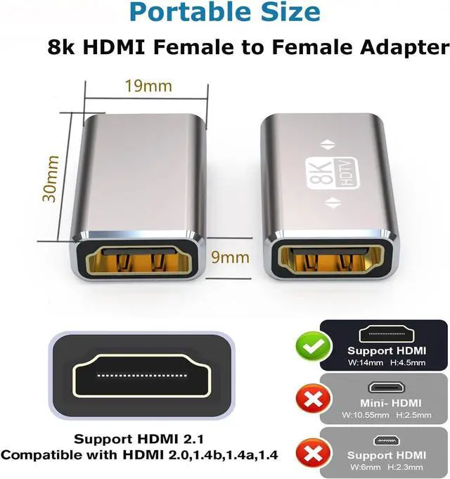 (* Tips: The max resolution of your HDMI output depends on both your devices and the HDMI cables used)Compatible with all HDMI DevicesConnect this 8k hdmi couper with hdmi cables for all hdmi devices such as PS5 PS4 Switch Fire TV TV Gaming PC FreeSync G-SYNC All GeForce RTX 30 series Soundbar Xbox Series X Xbox Series S All OLED TV 2021 Macbook Pro laptop Projector Monitor Fire TV Roku TV SHIELD TV. Indispensable 8k 4k hdmi cable 6 feet for home and office equipment. Support Mirror & Extend mode & MST Display mode. High Quality-Zero Signal LossFeaturing gold-plated connectors an aluminum-shielded casing and anti-interference shielding layerscoupled with an elastic convex curve design at the HDMI portthis ensures not only rapid heat dissipation and extended lifespan but also delivers ultra-stable connectivity with zero signal loss offering you a flawless premium viewing experience. Lifetime WarrantyHigh-quality 8K HDMI Female to Female Adapter 2-Pack All our products provide Lifetime Warranty We would appreciate you letting us know of any problems