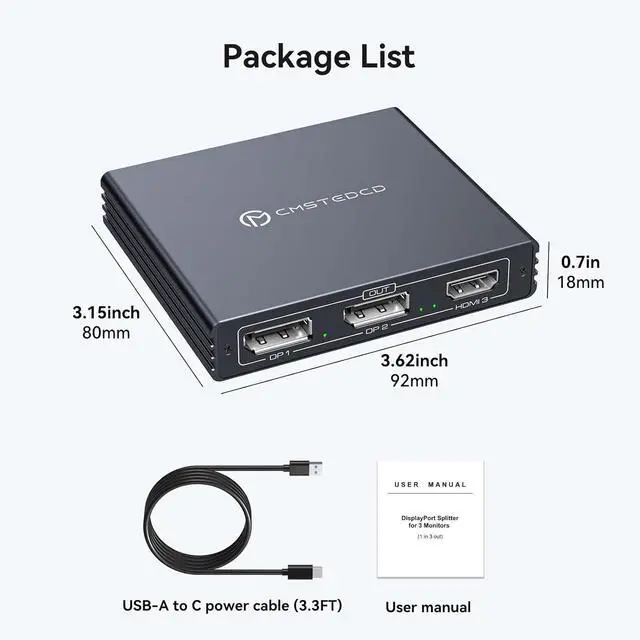 Use: Displayport Splitter is ready to use by simply connecting the source to the input via a DP cable connecting the three monitors to the output and powering them via the power cord included in the package. The Splitter must be connected to the USB 5V power port for power to work properly. If you encounter any problems during use you can contact us through and we offer a 24-month warranty