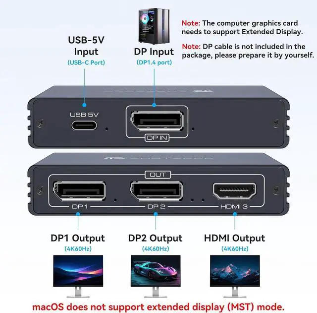 Multi-Screen Display Adapter: Display port Splitter 3 Monitors allows the DP signal to be mirrored (SST) or expanded (MST) from one source to 2 DP monitors and 1 HDMI monitor displaying a clear 4K UHD picture while transmitting high quality audio and video.