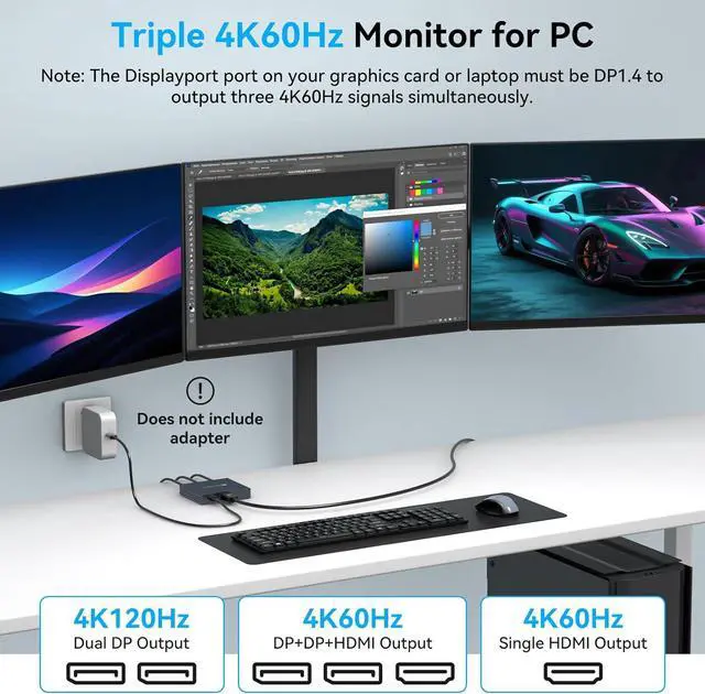 Ultra High Definition Resolution: Displayport MST Hub 3 Monitors supports DP 1.4 inputs for simultaneous output of 4K60Hz resolution when 3 monitors are connected at the same time and dual 4K120Hz when 2 DP outputs are connected individually. HDMI output ports support up to 4K60Hz only. It is backward-compatible with 2K120Hz/60Hz and 1080P120hz/60Hz. Vivid images give you more stunning on-screen color and contrast. The final resolution depends on your computer and cablesExtended/Mirror Display Plug and