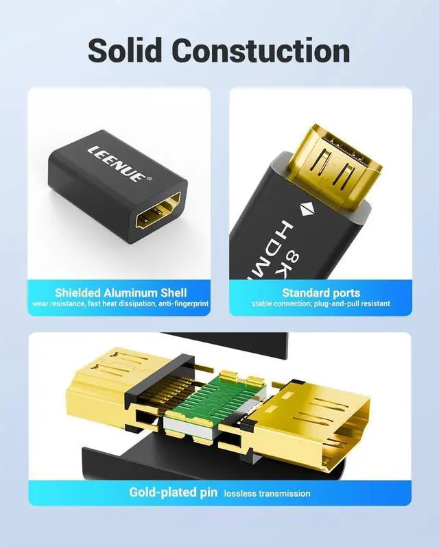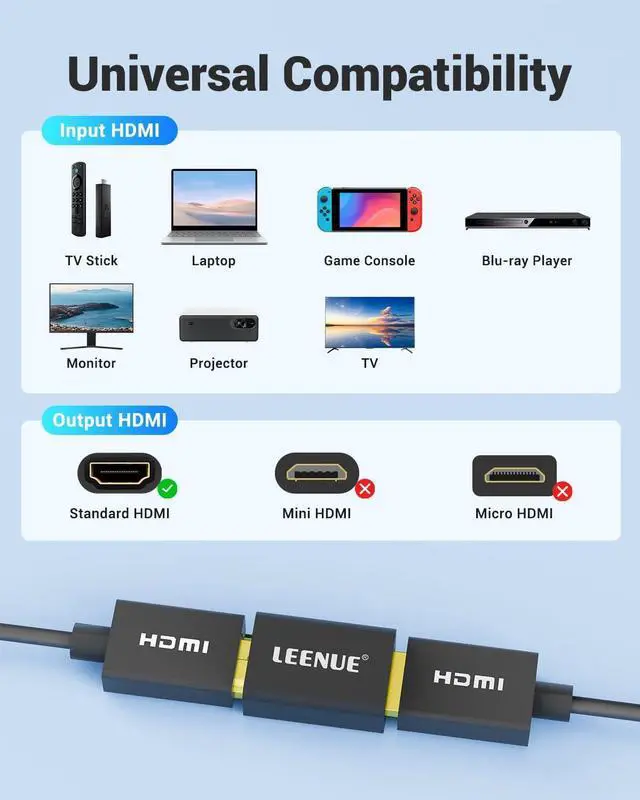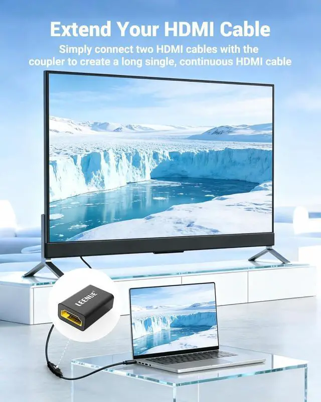 Wide Compatibility - The HDMI coupler female to female allows you to connect two HDMI cables and extend the distance between two devices with Standard HDMI Ports. This is the perfect solution for ensuring a seamless and convenient setup when the decoration/pre-embedded line is not long enough. Vibrant 8K Video - Our HDMI female to female adapter supports stunning 8K@60Hz Video Resolution with a 3D effect four times the resolution 4K. Immerse yourself in breathtaking visuals. Sound Quality - Our adapter supports advanced sound features such as 5.1 Dolby digital sound and Audio Return Channel allowing you to enjoy rich and immersive soundscapes.