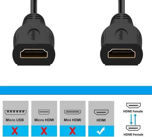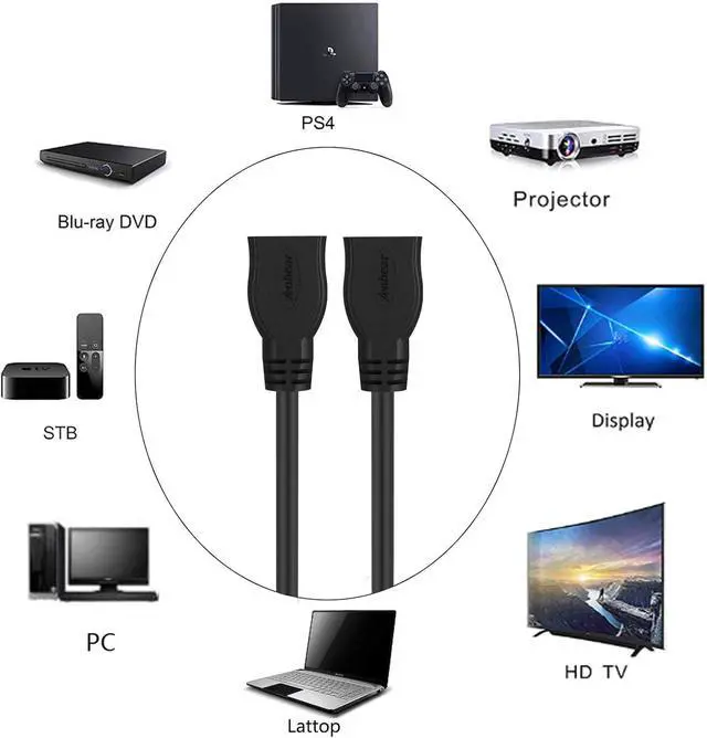 HDMI female to female cable easy extend your HDMI devices by connecting two HDMI A Type Male to Male cables together. Supports 4K*2K@60HZ 1080P@144HZ HDMI Ethernet Channel and Audio Return Channel (ARC) 3D Audio Return Channel Ethernet and Dolby 7.1 True HD. HDMI female to female is fully compliant with the latest HDMI standard; This female to female HDMI adapter is capable of carrying the increased bandwidth of HDMI 2.0 at 18 Gbps. Compatible with Fire TV Sticks Chromecast Roku stick Blu-Ray DVD player Gaming Consoles Satellite Box AV receiver TV HD cable box Xbox360 Xbox One S PS3 PS4 PS5 3D Television HDMI Selector Box computer and more.
