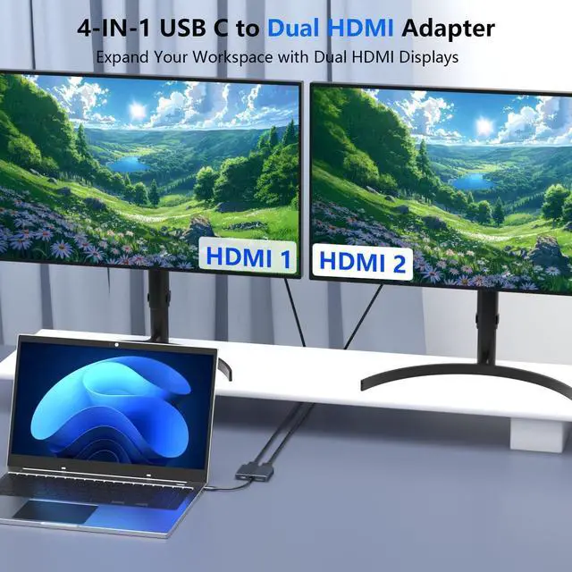4-IN-1 USB C to Dual HDMI AdapterThis dual HDMI adapter for 2 monitors allows you to easily expand your laptop's USB-C/Thunderbolt 3 port to 4 essential ports: 2x4K@30Hz HDMI port 1xUSB 3.0 ports 1xUSB-C PD (Power Delivery) port. Its perfect for multitasking presentations and immersive viewing.