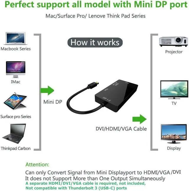 Plug and Play: The 3 in 1 converter can be installed on your mini dp devices easily with no software or drivers required, and no external power supply required.