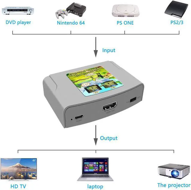 HDMI Converter: Input RCA signal source to an HDMI TV/Monitor/Projector.
