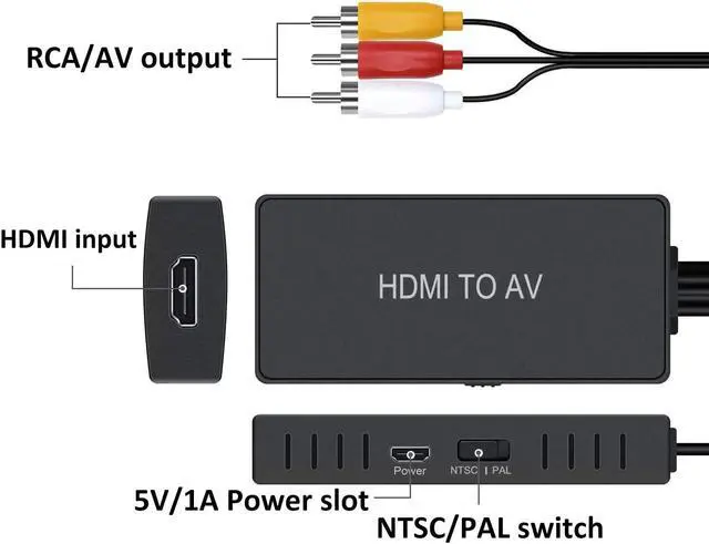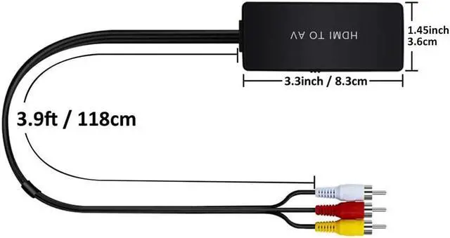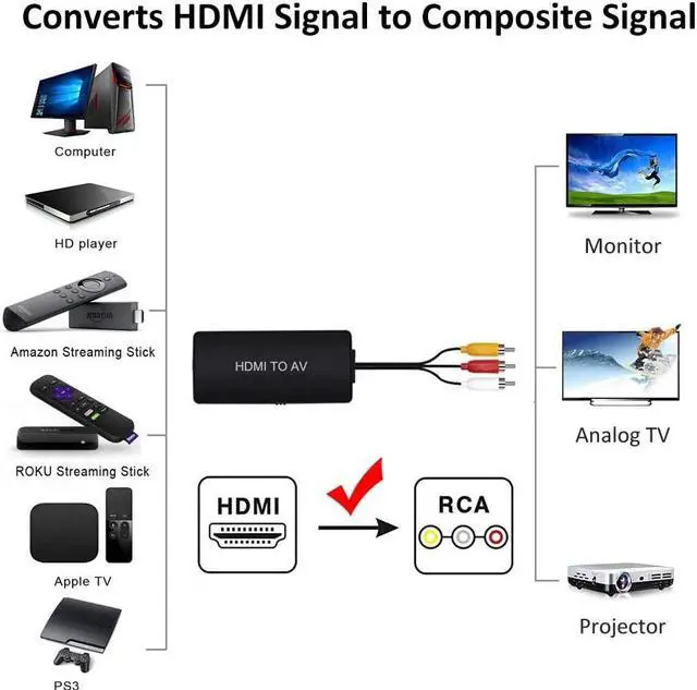 HDMI to RCA Converter - It will convert HDMI signal (PS4 / PS3 / Xbox One / Nintendo Switch / Roku streaming stick / Fire Stick / PC / DVD& more) to RCA composite signal for AV receiving device( old TV, monitor, projector). Plug and Play - Please note this converter does not support 3D andf 4K HDMI video. Support HDMI 1.3 and HDMI resolution up to 1080P. No need to install any drivers, portable and flexible. All-in-One HDMI to RCA Converter - Equipped with RCA cable, HDMI cable and USB power cable.