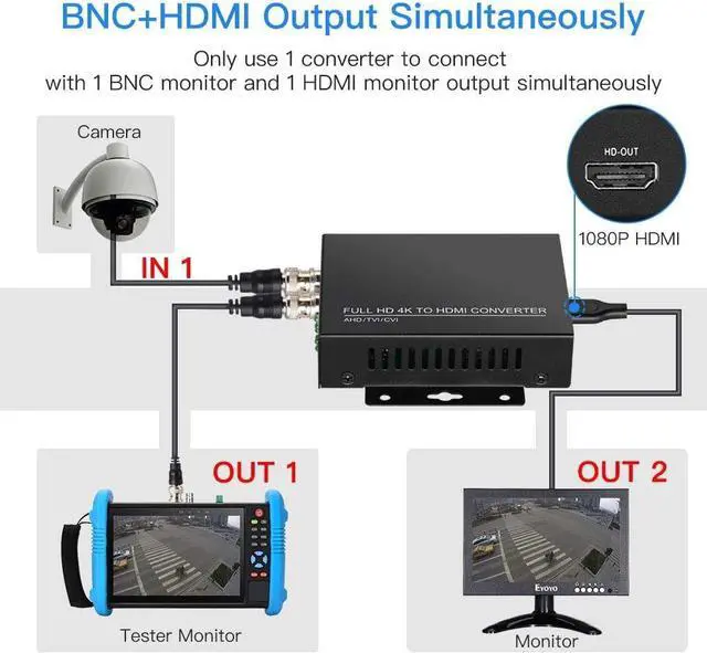 HDMI Output: Plug and play; It converts TVI CVI AHD CVBS security camera signals to HDMI monitor. 4K