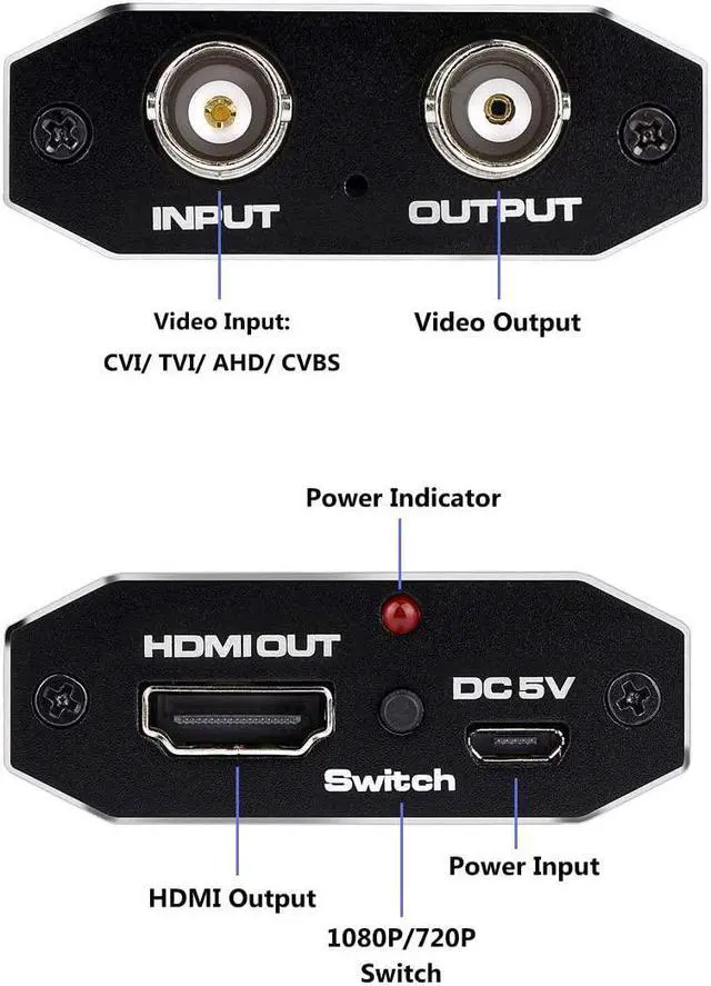 HDMI Output: Plug and play; It converts TVI CVI AHD CVBS security camera signals to HDMI monitor. The HDMI Video output is 1080p/720P@60Hz resolution You can select by the switch. And It have BNC Video Loop Out port that you can connect multiple monitors. 4K