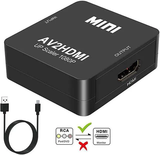• **********1.RCA to HDMI Video Audio Converter: Converts analog RCA composite input to HDMI 1080p (60HZ) output,displayed on HD TV/Moniter, support HDMI 1080p or 720p output.*****2.Easy to Use: No extra drivers need, just plug and play,easy to use.Please hook up the USB power cable (included) to 5V power source during use.*****3.Format Compatibility: Support PAL, NTSC3.58, NTSC4.43, SECAM, PAL/M, PAL/N standard TV formats input.*****4.Extensive Use: Widely applied to PS2,PS3,Xbox,N64, WII, STB, VHS, VCR, DVD Players and other devices with standard composite AV input.*****5.Package Contents: 1x RCA to HDMI Converter, 1x USB cable. Please free feel to contact us if you have any product problems.