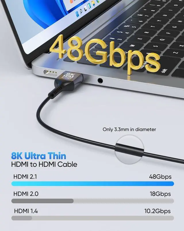 UHD Video: Ultra thin HDMI cable complies with standard HDMI version 2.1. Support resolution to 8K@60Hz Backward compatible with 4K@120Hz 4K@60Hz 2K@144Hz 1080P. also support 3D 48-Bit Deep Color Dynamic HDR eARC HDCP 2.2 & 2.3