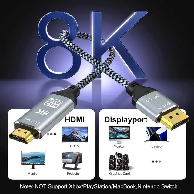 (Note: Not compatible with PS4/5 or Xbox)Anti-interference materialThis DisplayPort to HDMI 2.1 cable supports HD audio and video streaming with tinned copper wires and triple shielding for stable signal transmission. The non-locking plug design protects devices from damage during insertion and removal. The one-piece aluminum alloy housing and 24K gold-plated connectors extend lifespan and provide a more reliable connection experienceUniversal compatibilityFully plug-and-play saving time and enabling quick DisplayPort to HDMI conversion. This display port to hdmi cord is compatible with BenQ HP iiyama Alienware and more. and any other device equipped with a DisplayPort to TVs projectors monitors VR headsets and more.