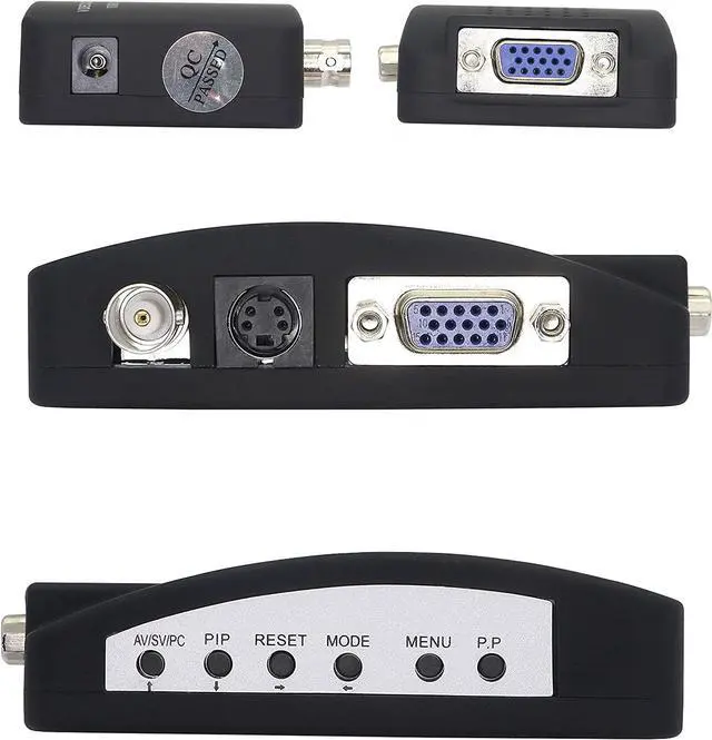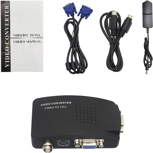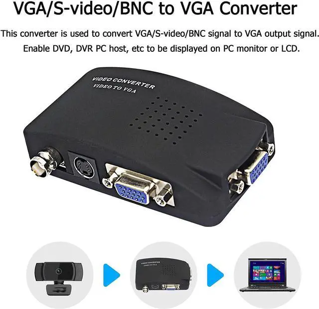 BNC to vga converter: It has VGA S-video and BNC input and VGA output by which it can convert S/Video interlaced signals of DVD/DVR CCTV Camera or other devices into VGA signal and display on PC monitor or LCD. This conventor is with the different 2 VGA interfaces pls select the corrent the VGA interface as inout or output interface. Like when you connect BNC as the input signal soure to VGA montor then you need connect VGA OUT interface doesn't connect the VGA IN interface. Easy to install and operate instantly switch the source between Video S-Video and PC with a single button and turn your monitor in to a high resolution picture output. Plug and play plug in the attached power and you can use it no need to drive. Package contain one English version of detailed instructions. Supports the resolution up to 800 x 600@60HZ 800 X 600@75HZ 1024 x 768@60HZ 1280 x 1024@60HZ 1440 x 900@60HZ 1680 x 1050@60HZ 1920 x 1080@60HZ 1920 x 1200@60HZPls do not set the high resolution to output more than them. If the resolution of the monitor is out of this range it may not be displayed.