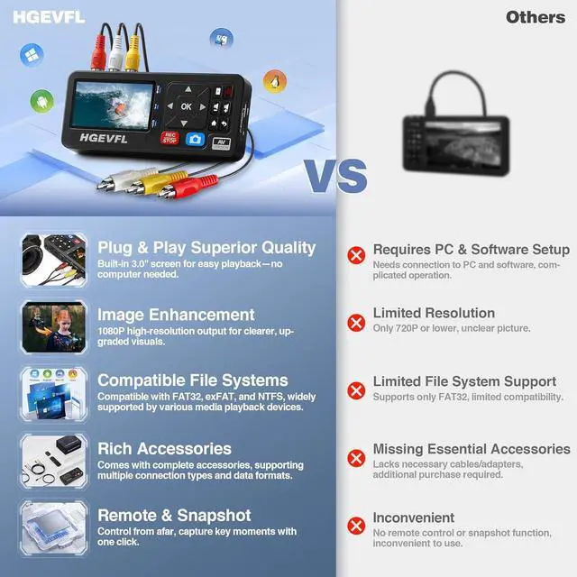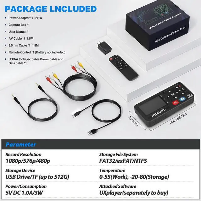 Accessories Included: Package includes a 5V power adapter HDMI cable USB-C cable AV cable user manual and remote control. The remote enables convenient operation like one-touch recording playback and screenshot capturingperfect for digitizing and preserving home video contentSimple