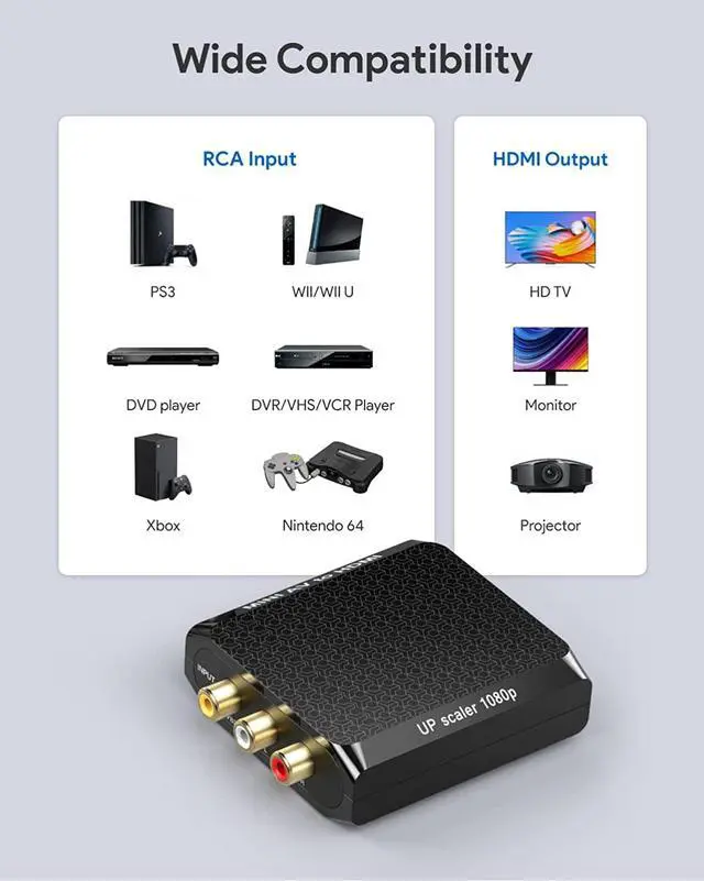 Better Performance: RCA to HDMI adapter offers HDMI output up to 720p/1080p 60Hz resolutions provides advanced signal processing technology with great precision colors and details.