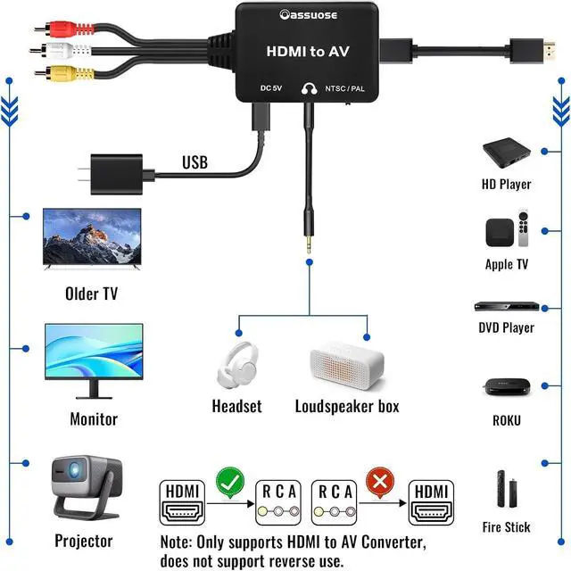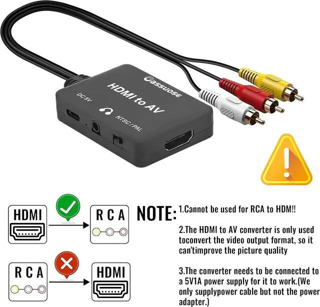 MINI HDMISpecial Note: Does not support reverse work cannot be used as an RCA to HDMI converter app (old video game system to new TV) please set to NTSC format when used in the United States! If your TV displays black and white images please change the output format via the switch on the converter. This feature requires devices with HDMI 1.2 1.3 or 1.4 ports Compatible with various streaming devices such as: Fire TV stick Chromecast google TV TV Roku Xbox DVD Android TV Box etc. Plug and play; no software installation required; please connect the USB C power cable to the power adapter when working support input resolution 480i 480P 720P 1080i 1080P;