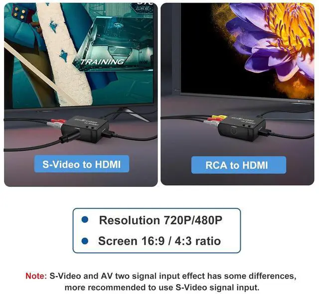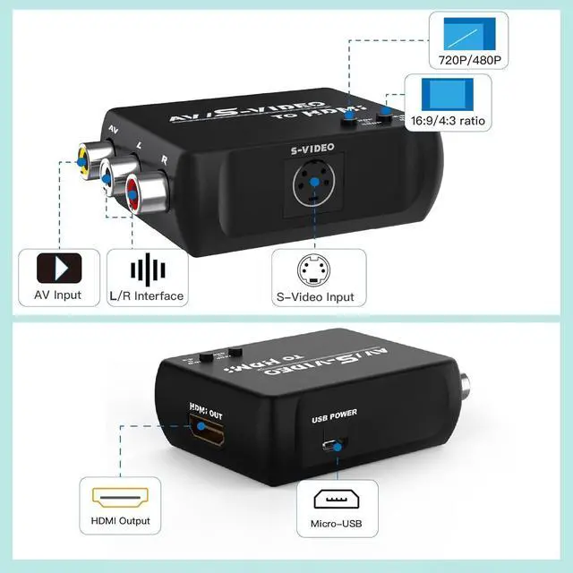 HDMI Converter: Convert RCA AV CVBS composite (Yellow White Red) input to HDMI 720P/480P 4:3 ratio output on HDTV/Monitor. Rescue your old devices and relive your happy days. *S-Video to HDMI Converter*Video processing by the S video signal source output HDMI resolution 720P/480P or screen 16:9 / 4:3 ratio display in HDTV/monitor clear picture is so simple! *Plug and Play* This AV/S video to HDMI converter is plug and play no additional drivers required low latency. The user interface is friendly easy and fast to operate. *Wide Compatibility*Supports many old game machines XBOX VHS DVD VCD etc. (such as NES SNES N64 GC FC PS1 PS2 PS3 MD1-3 SS DC). *Attention & Package*Please ensure to connect this AV/Svdieo to hdmi converter to power source to make it work.