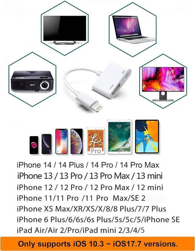 The Lightning Digital HDMI Adapter supports mirroring content (pictures movies games etc. ) displayed on the device screen to a larger screen such as a TV monitor projector or any other compatible screen with a resolution of up to 1080P. This MFi certified HDMI adapter is perfect for iPhone 14/ 14 Plus/ 14 Pro/ 14 Pro max iPhone 13/ 13 mini/ 13 Pro/ 13 Pro max iPhone12/ 12 mini/ 12 Pro/ 12 Pro max iPhone 11/ 11 Pro/11 Pro Max iPhone X/XR/XS/XS Max iPhone 8 7 6 Plus iPhone 5/5S/5C/SE 2; iPad Air/mini/Pro.