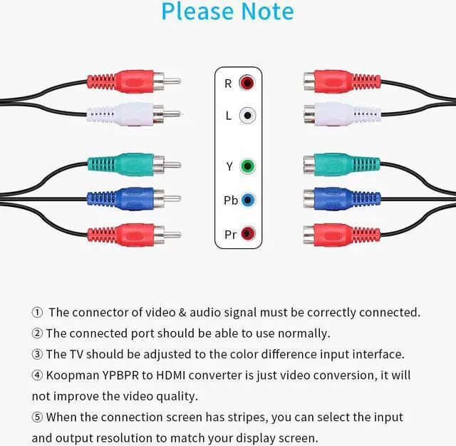 Component (input) to HDMI (output) ConverterKoopman YPbPr to HDMI adapter converts analog component video and R/L audio signal to digital HDMI signal enables your old DVD player cable box and gaming consoles to work with your fancy new television display and projector.