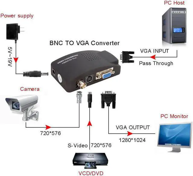 GOOD COMPATIBILITY: VGA 4 pin S-video BNC input. VGA output. Convert VGA/S-video/BNC to VGA. The Video Converters Supports output from 800*600 to 1920*1200 VGA resolution. If you want to convert RCA to VGA?